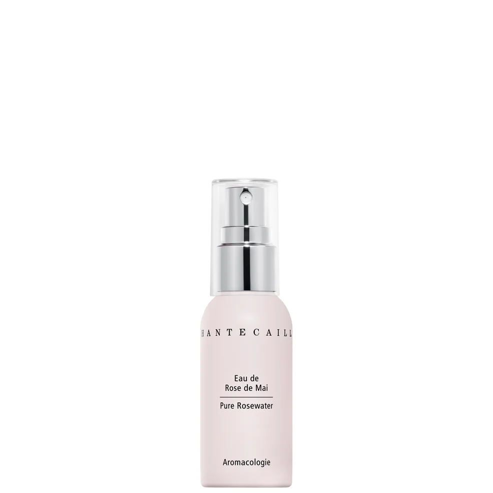 A limited-edition travel-size aluminum bottle decorated with Chantecaille’s signature Rose de Mai.