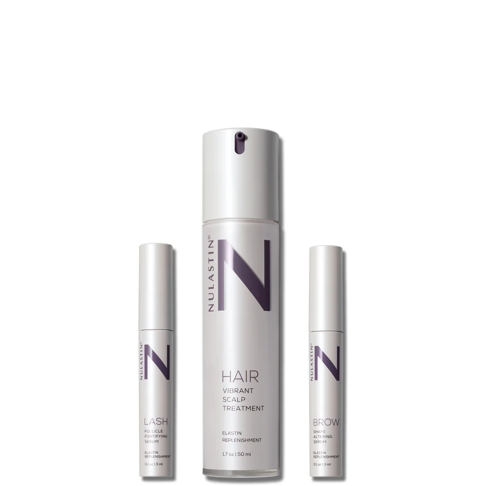 An award winning starter kit featuring HAIR Vibrant Scalp Treatment, full size LASH Follicle Fortifying Serum and full size BROW Shape Altering Serum- cruelty-free, clinically tested hair, eyelash & eyebrow enhancing formulas formulated to deliver thicker, fuller looking hair, lashes and brows in 6 weeks with double the results in 12. Powered by ElastaplexĀ® Technology, a proprietary blend of signal peptides & proteins to support all stages of the natural growth cycle and help anchor-and-bind the hair, lash & brow follicles at the root, supporting reducedshedding & fall out, for high impact, long lasting results. This trio is perfectly sized for a full 6 weeks of twice daily use- AM + PM.