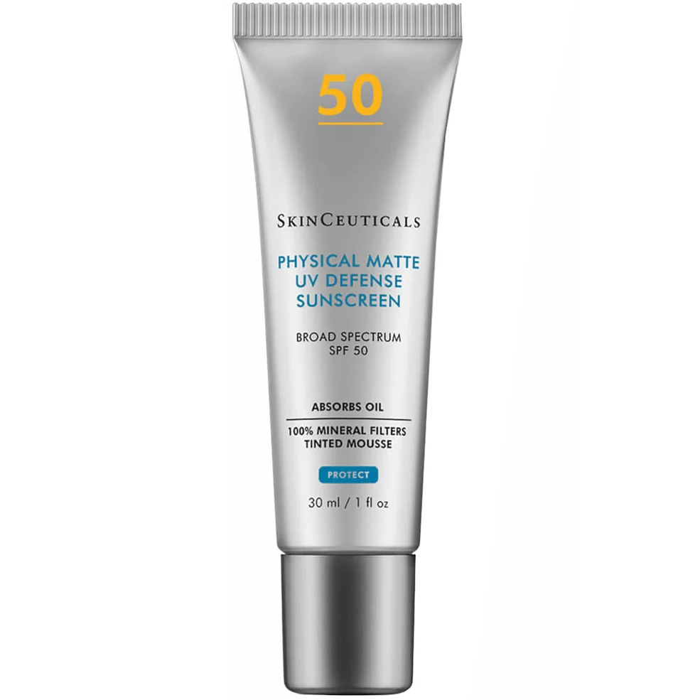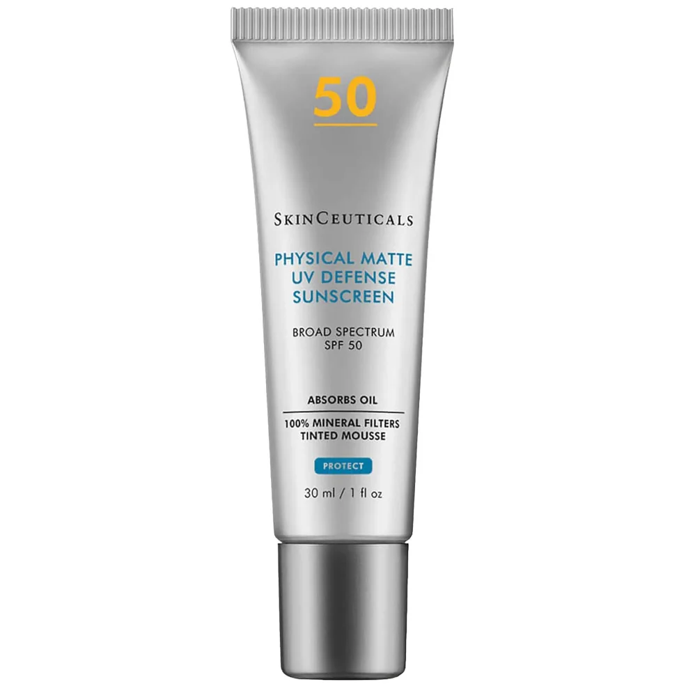 SkinCeuticals Physical Matte UV Defense SPF 50 is a daily, oil-absorbing sunscreen designed to provide facial sun protection. This mattifying, 100% physical sunscreen is formulated with titanium dioxide and zinc oxide to deliver high broad-spectrum UV protection with a shine-free, matte finish, even in the most humid temperatures. Its weightless mousse texture with a universally flattering tint dries to a powder finish giving your complexion a smooth look while minimizing the appearance of pores.