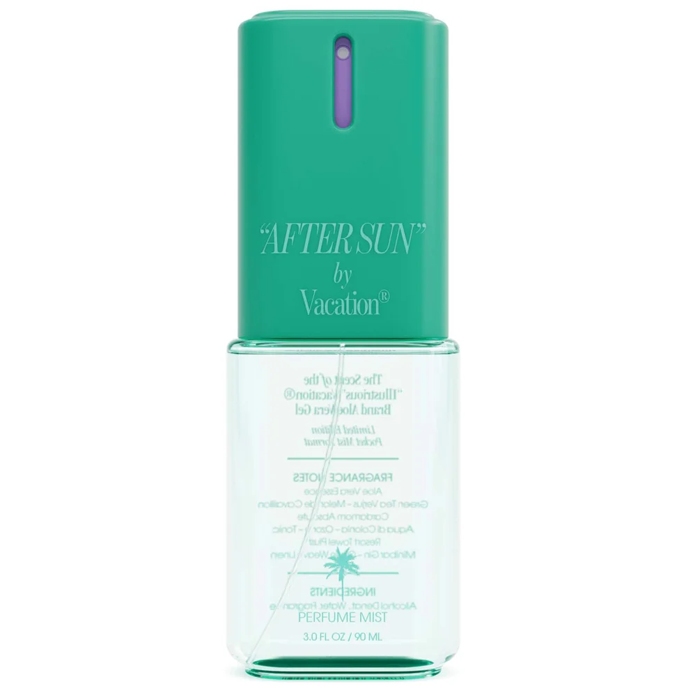 “AFTER SUN” Body Mist by Vacation® is a convenient, lightweight version of Vacation’s iconic “AFTER SUN” Eau de Toilette. Spritz it on its own or layer it over Vacation® sunscreen for a fresh boost of nuanced fragrance. Features notes of Aloe Vera Gel, Green Tea Verjus, Acqua di Colonia & more.