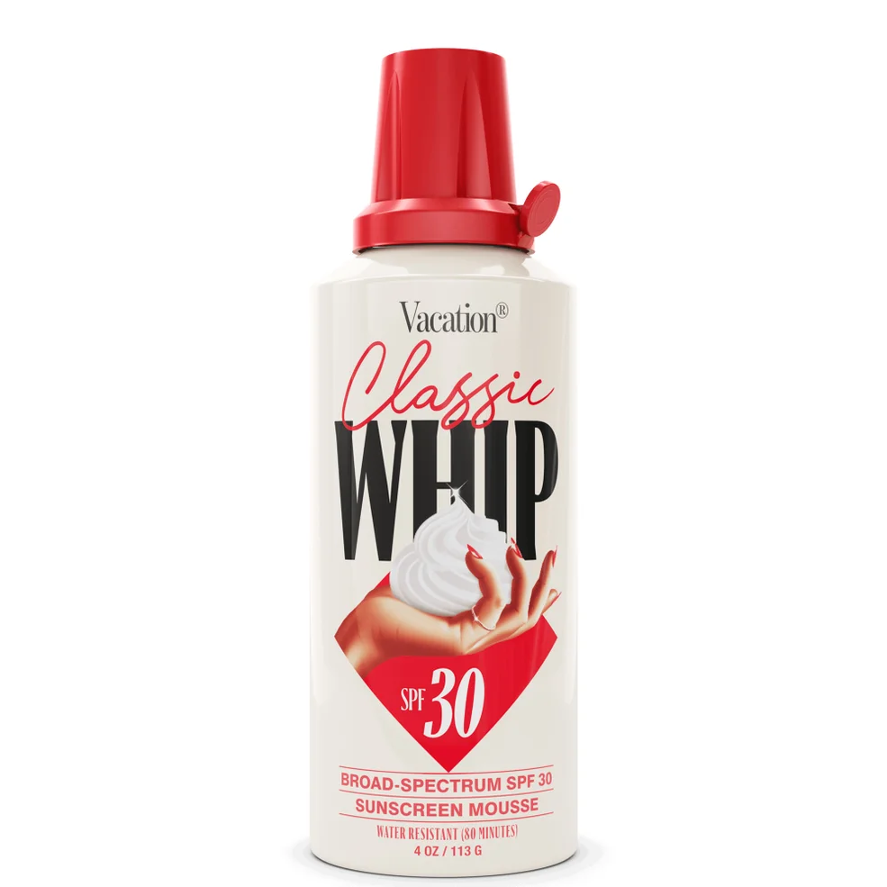 Vacation Classic Whip SPF 30 Sunscreen Mousse is a “lighter-than-air” sunscreen made with eco-friendly propellants and an authentic “tilt valve” actuator that produces perfect, star-shaped mountains of foam inspired by everyone’s favorite after-dinner indulgence.
