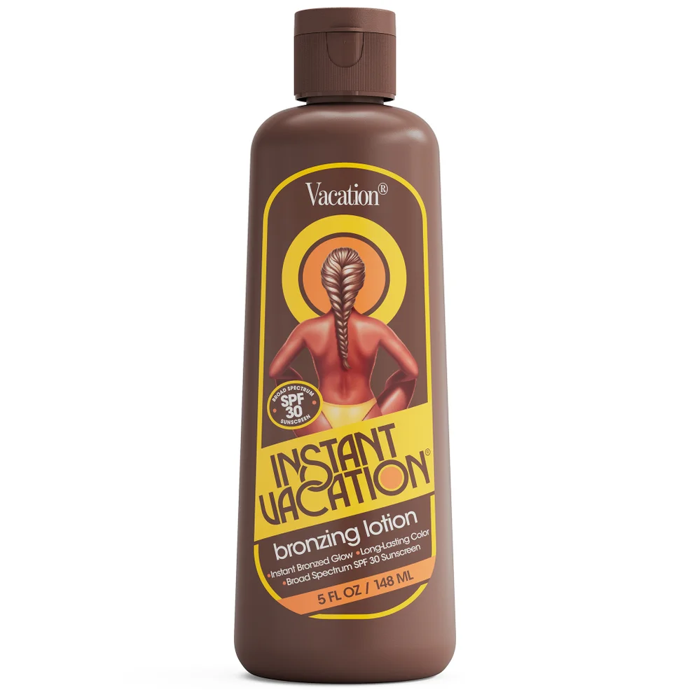 Instant Vacation SPF 30 Bronzing Lotion by Vacation instantly delivers a bronzed, sun-kissed look while providing SPF 30 protection. This lightweight, moisturizing lotion spreads and dries down quickly for fast application and easy color layering, while its gourmand scent transports you to paradise.